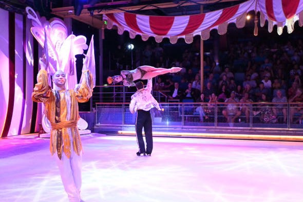 A: EXPECT TO be amazed! These shows have amazing skating talent from all around the world! Every day I step on the ice, I truly am proud to be a part of something so special. Every ship has a different show, some even have two ice shows! My show is called, “Ice Under the Big Top” and it tells the story of a ringmaster creating his own circus! Justin and I are the “trick pair” in the show so from us you can see some of my favorite elements such as a partner backflip, a flying squirrel, and a bounce spin!