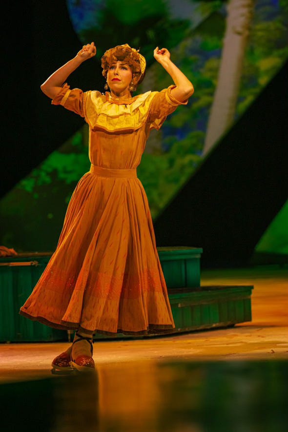 A: THAT IS a tricky question! When my sister watched Encanto at home and then saw me perform, she told me that I truly was the live version of that character! I loved getting to portray Tia Pepa and act out all of her different moods and expressions! However, when I would portray Ariel, I was also skating with my partner, Justin [Hergett]. I loved getting to skate and perform with him. That truly was a dream come true! These two characters will always hold a special place in my heart!